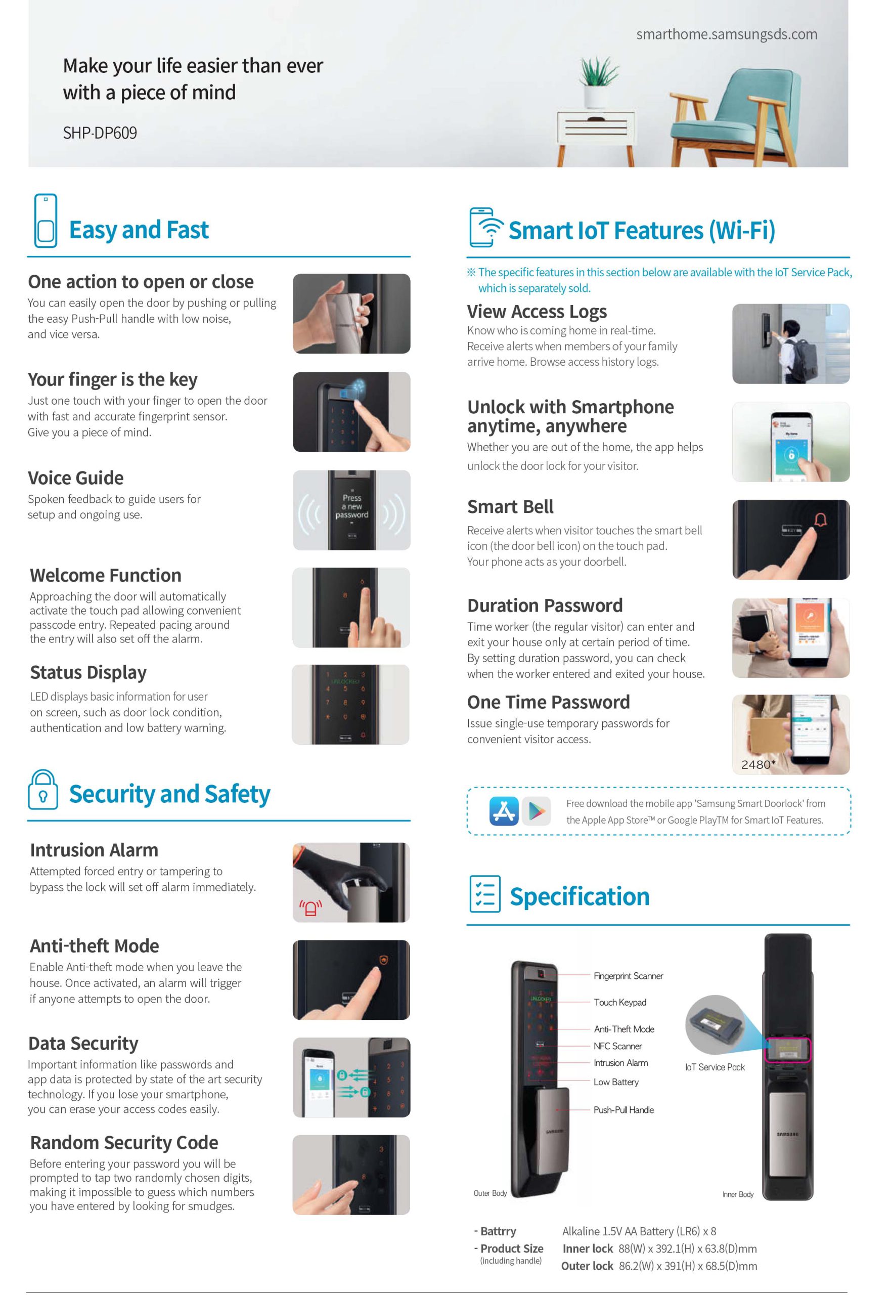 Ngoài những tính năng quen thuộc mà hầu hết các sản phẩm khóa điện tử đều có như vân tay, mã số, thẻ từ, chìa cơ. Khóa điện tử Samsung SHP DP609 còn có khả năng mở rộng chức năng mở qua Smartphone.