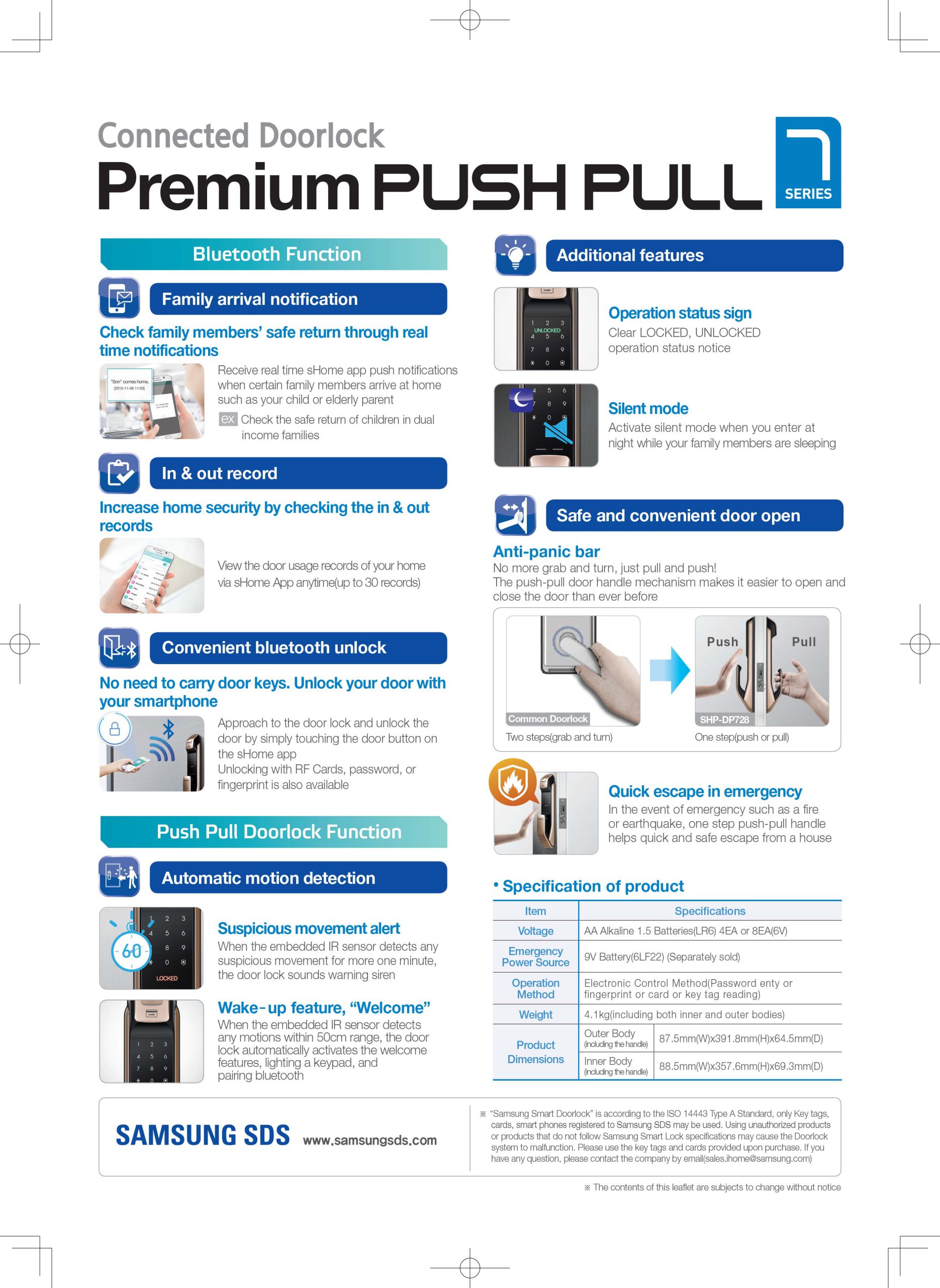 Ngoài ra, kích thước 3 chiều của khóa vô cùng hợp lý với cấu tạo chắc chắn, khóa Samsung SHP-DP728 Gold phù hợp lắp đặt với hầu hết các loại cửa (đặc biệt là cửa gỗ) có độ dày cửa 35~80mm (AML220: 35~60mm, AML320: 37~80mm).