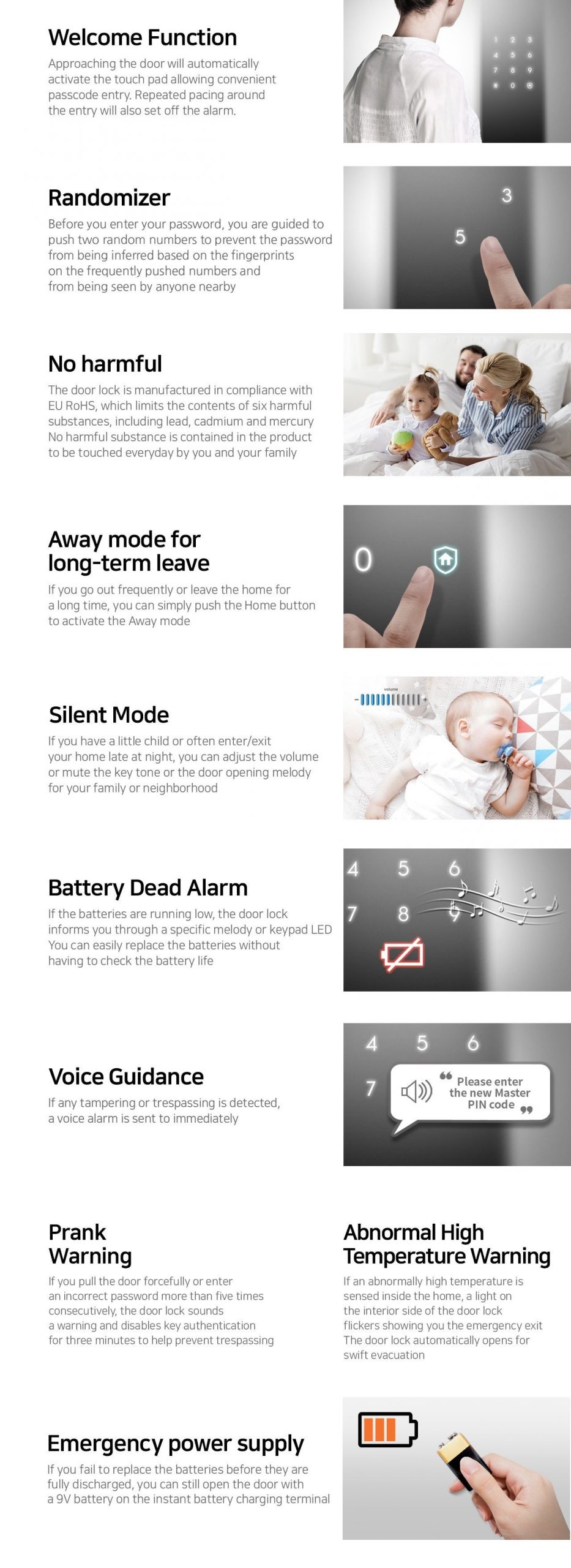 - Nếu có ai đó cố gắng mở khóa cửa một cách trái phép, khóa điện tử sẽ kích hoạt hệ thống báo động để cảnh báo. Nếu số lần đầu vào không chính xác vượt quá giới hạn cho phép, hệ thống sẽ phát ra âm thanh báo động to lớn, giúp cảnh báo người dùng và những người xung quanh.