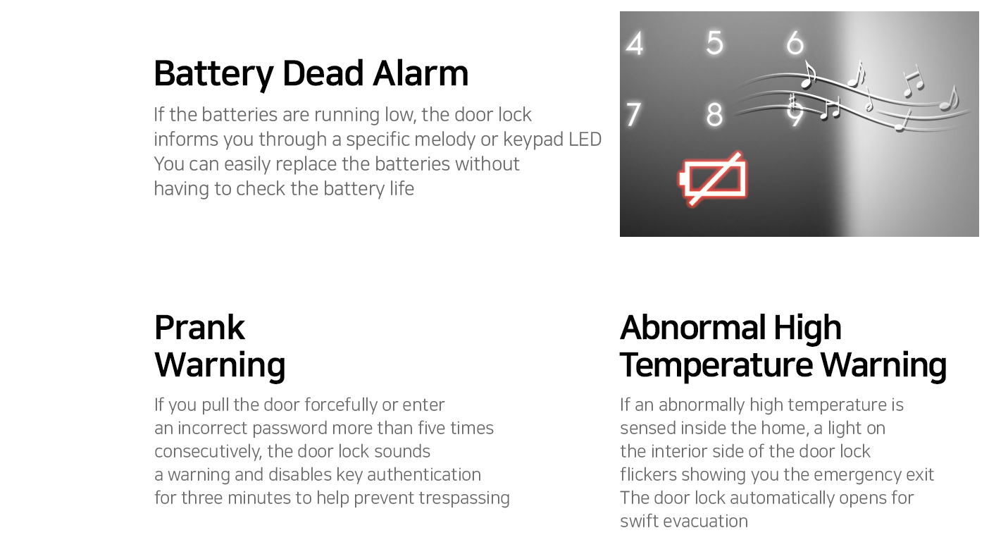 - Hệ thống cảnh báo pin yếu: Khi phát hiện pin yếu, khóa sẽ thông báo tới Smartphone, đồng thời hiển thị đèn báo trên màn hình khóa.