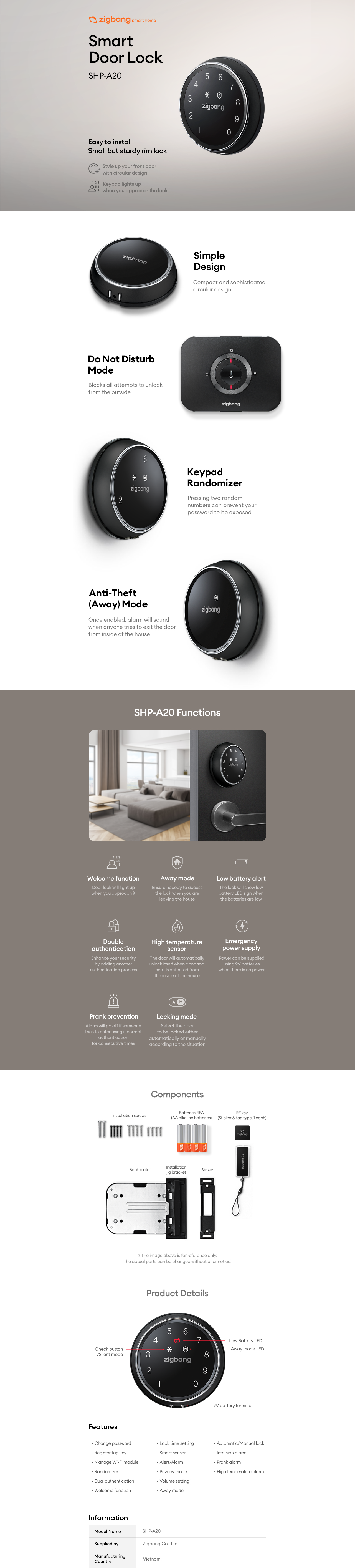 Tuy nằm trong phân khúc giá rẻ, nhưng khóa cửa điện tử Zigbang SHP-A20 có độ bảo mật cao không thua kém gì những sản phẩm có phân khúc giá cao hơn. Tính năng bảo mật của khóa bao gồm: